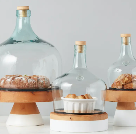 The dramatic silhouette of a vintage wine bottle demijohn created the perfect shape for our Demijohn Cloche. Made of recycled glass mouth-blown into authentic inspired molds, the cloche is the upper half of the bottle after being cut in two. Featuring a distressed black rim and topped with a sustainably-sourced wood cork, this decorative accent is perfect in its practical use as a fruit, cheese or bread cover, or simply as a terrarium. Pair this glass cloche with serveware pieces like cake stands, serving trays and trivets for a large array of styles and arrangements. -Each cloche may vary from images shown in coloring, size, and shape. -Recycled glass has a slight vintage green, blue tint and can contain small bubbles and imperfections.