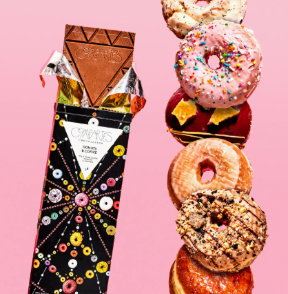 Our best-selling milk chocolate, Donuts & Coffee chocolate bar features donuts from the best Los Angeles donut shops. We break the donuts up and mix them into the most creamy delicious milk chocolate you will ever taste. Add in coffee grounds from some of LA's best coffee shops and you've got yourself a winner! Donuts & Coffee chocolate bar features a geometric stylish pattern made from donuts and coffee on the custom box of our gourmet and delicious chocolate bar! Handmade in our Los Angeles chocolate kitchens.