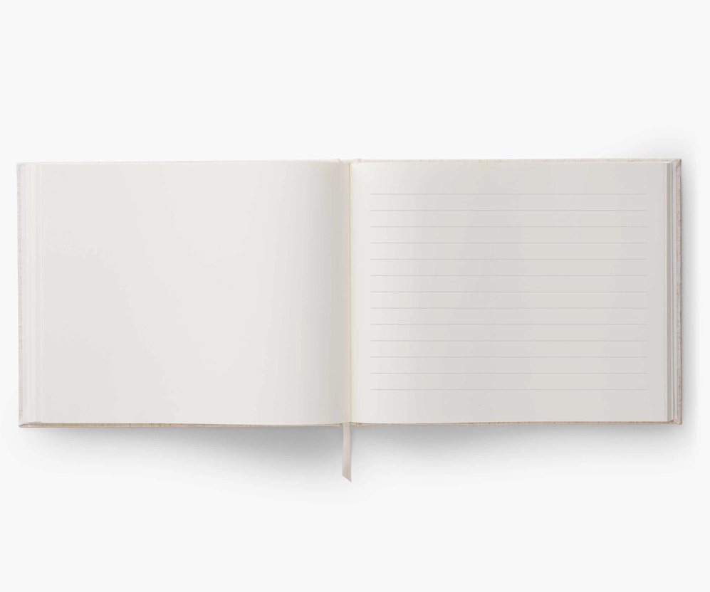 Our new embroidered guest book is a large hardcover journal with 144 interior pages, half lined and half blank so guests can write a note, add a sketch, or paste in a photo to create a one-of-a-kind keepsake. The cover is wrapped in book cloth and embroidered with our blue Wildwood florals and metallic gold accents, and a grosgrain ribbon bookmark will save your place. The perfect “something blue” for weddings, events, and guest rooms alike.