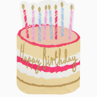 Pack of 12 Cake Shaped Happy Birthday Napkins by Talking Tables. There can never be too many cakes at a party! With a unique shape and colorful design, these disposable napkins are the perfect addition to any birthday table and ideal for serving cake. We have removed the foil from this product to be more eco-friendly. Each pack contains 12 paper napkins. Size: 13" x 13" (33cm x 33cm) unfolded.