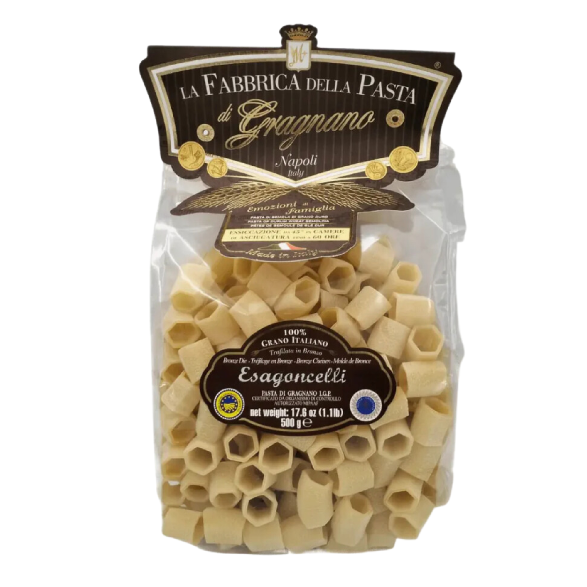 La Fabbrica Della Pasta has created the first and only hexagon-shaped artisanal pasta. Esagoncelli is a short, hexagon-shaped pasta shape, one of 3 extraordinary new hexagonal pgi-certified formats. This fascinating and unique shape is as delicious as it is beautiful, and pairs well with many sauces. Add a special touch to your weeknight pasta dish with this innovative pasta format. La Fabbrica Della Pasta has been making pasta for three generations in Gragnano, a small town nestled in the hills near Naples, famous for its pasta production for over 500 years. Pasta from Gragnano is very special: made with local spring water and high-protein durum wheat which helps keep the pasta al dente, then extruded through a bronze die, giving the pasta a porous texture that helps it bind with sauce, and dried slowly at a low temperature. Net weight: 500 g/ 1.1 lb Ingredients: durum wheat semolina, water