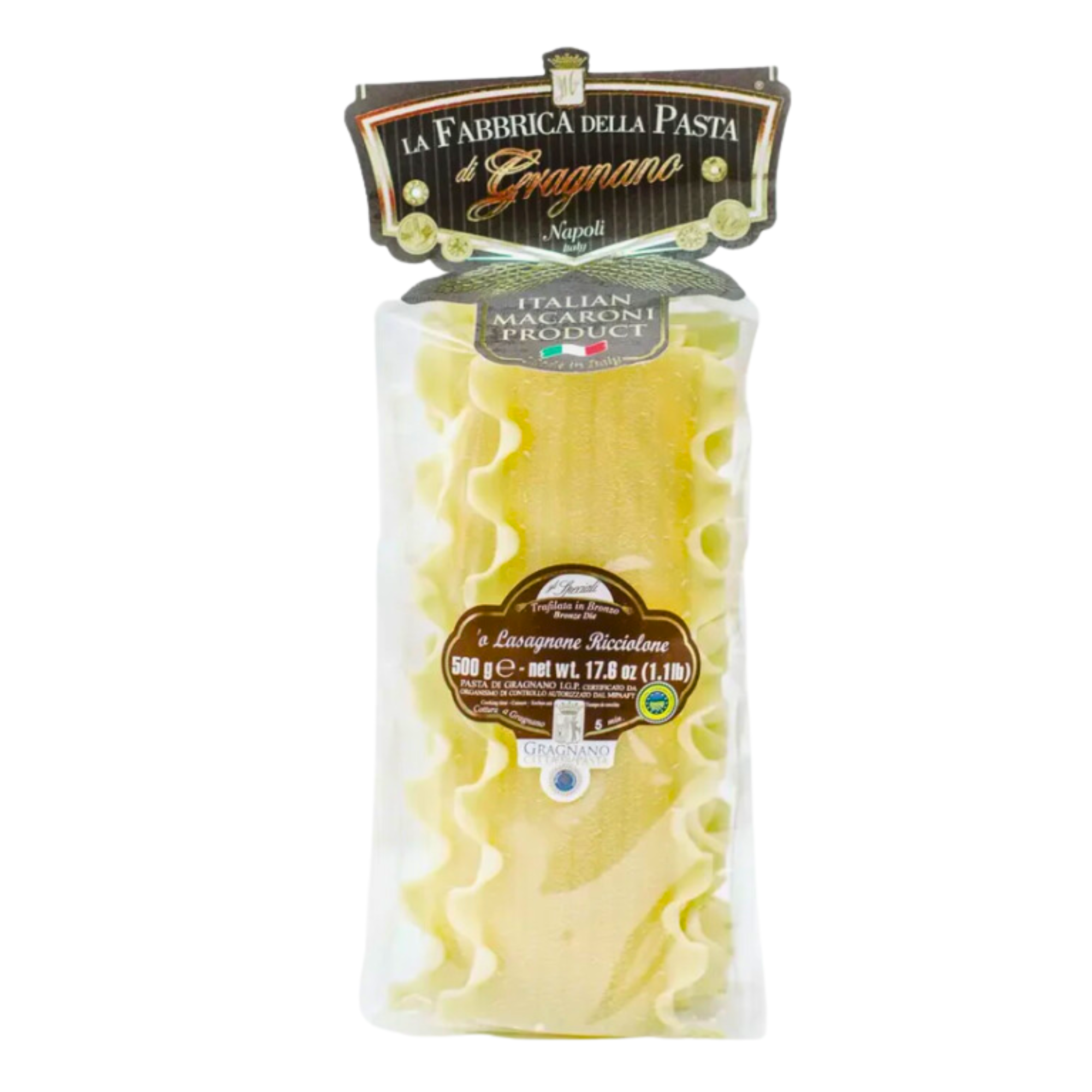 The curly edges of these large lasagna noodles help create space between the layers of your baked lasagna dish, making room for more cheese and meat sauce. La Fabbrica Della Pasta has been making pasta for three generations in Gragnano, a small town nestled in the hills near Naples, famous for its pasta production for over 500 years. Pasta from Gragnano is very special: made with local spring water and high-protein durum wheat which helps keep the pasta al dente, then extruded through a bronze die, giving the pasta a porous texture that helps it bind with sauce, and dried slowly at a low temperature.