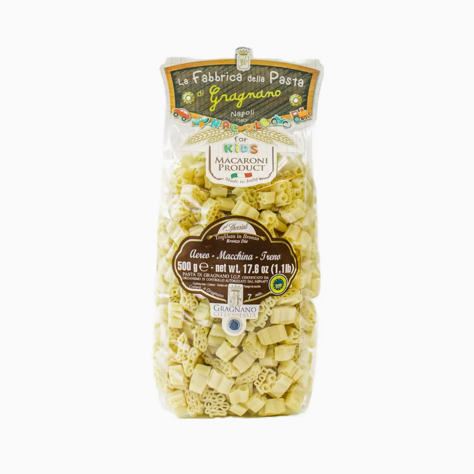 This adorable pasta is shaped like plans and trains, so much fun for kids! La Fabbrica della Pasta has been making pasta for three generations in Gragnano, a small town nestled in the hills near Naples, famous for its pasta production for over 500 years. Pasta from Gragnano is very special: made with local spring water and high-protein Durum wheat which helps keep the pasta al dente, then extruded through a bronze die, giving the pasta a porous texture that helps it bind with sauce, and dried slowly at a low temperature. La Fabbrica della Pasta is amongst La Fabbrica della Pasta has remained at the top of the twelve remaining pasta makers in the region (down from the original 300), and became the very first pasta factory in the world to obtain IGP (Protected Geographical Origin) certification for its pasta. They are also the first pasta factory in Gragnano to make a strictly bronze drawn artisanal Gluten Free Pasta! Net weight: 500 g/1.1 lb Ingredients: Durum wheat semolina, water