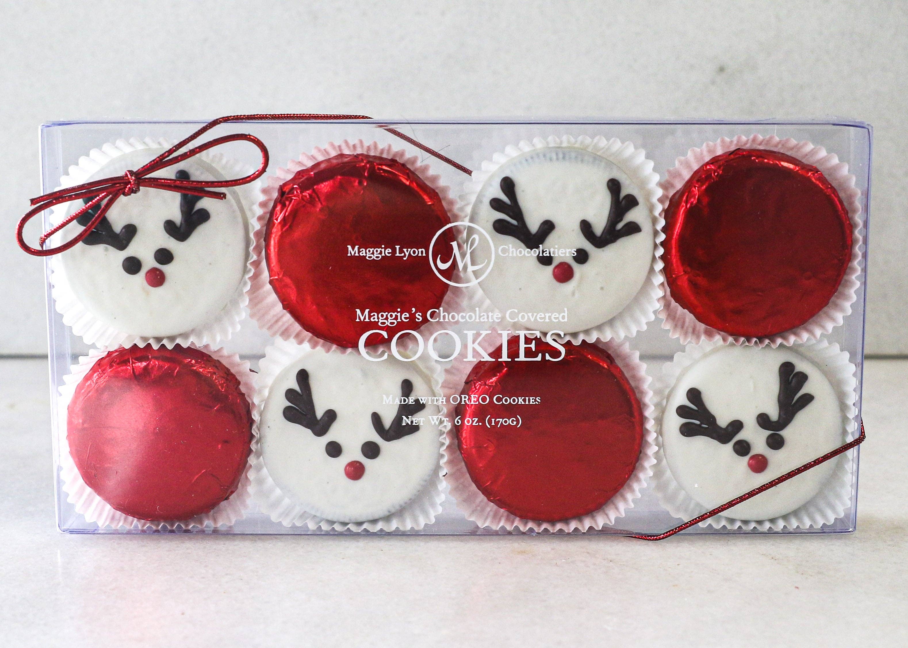 8pc. Maggie Lyon's milk and white chocolate covered cookies, hand-decorated with a reindeer design. Made with Oreo cookies. Shelf Life: 6-9 months.