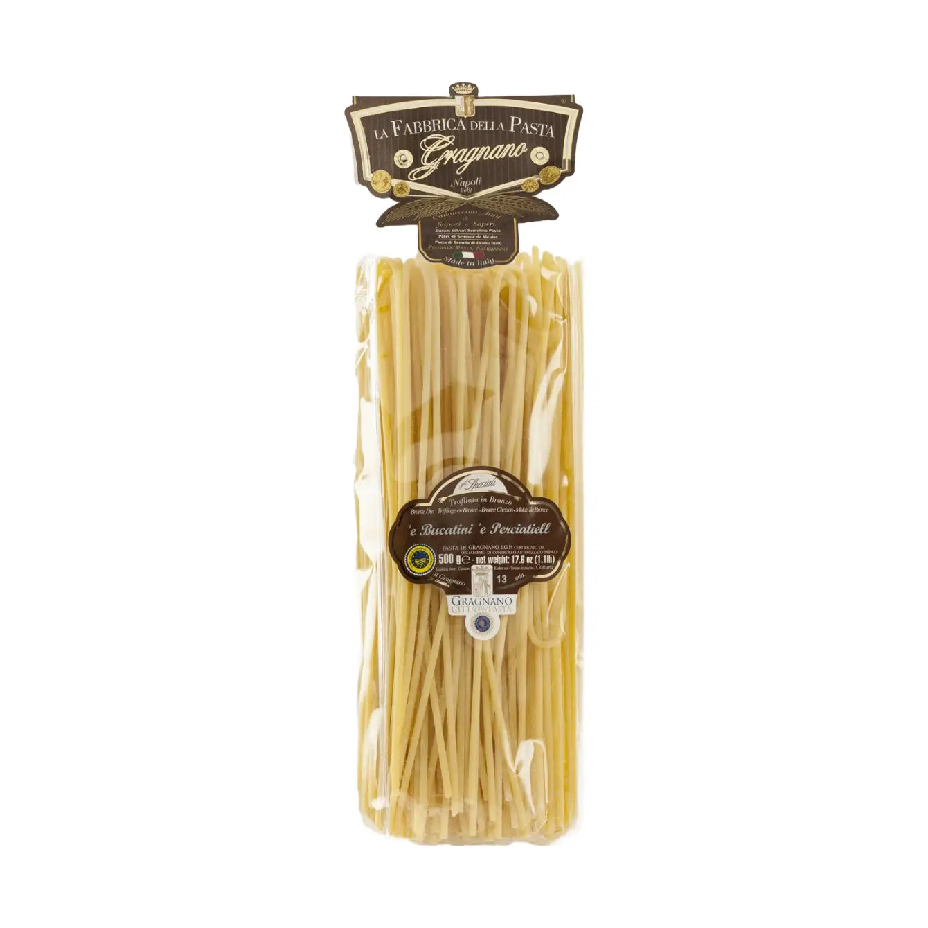 Bucatini e perciatelli igp is a thick spaghetti with a hollow center, shaped like a thin straw, traditionally served with a chunky tomato sauce or with a sauce of onion, pancetta, peperoncino, and tomato. La Fabbrica Della Pasta has been making pasta for three generations in Gragnano, a small town nestled in the hills near Naples, famous for its pasta production for over 500 years. Pasta from Gragnano is very special: made with local spring water and high-protein durum wheat which helps keep the pasta al dente, then extruded through a bronze die, giving the pasta a porous texture that helps it bind with sauce, and dried slowly at a low temperature. La Fabbrica Della Pasta is amongst 12 remaining pasta makers in the region (down from the original 300), and became the very first pasta factory in the world to obtain igp (protected geographical origin) certification for its pasta.