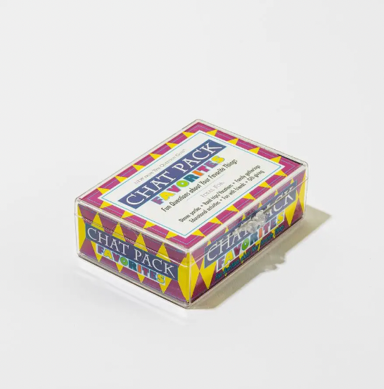 Chat pack™ favorites contains 156 cards, each one featuring a question guaranteed to spark an instant conversation about one of your favorite things! The perfect pastime for adults and kids alike, chat pack™ favorites will have everyone talking and laughing in no time––just pull out a card and let the fun begin! Ideal for: Parties Road trips and vacations Family gatherings Educational activities Fun with friends Gift-giving contents: 156 stylized cards, 3/75" x 3" x 1.25" plastic case Order code: cpf Isbn: 978-1-9395320-08 How to play Pick any card in the deck at any time; there is no particular order to the questions. Feel free to reword or alter any question in the pack. Each question is simply a starting point; take it in any direction you desire. Try to avoid one-word answers. Instead, expand on your answers as often as you can, allowing the question to lead into a full-blown conversation. Have fun!