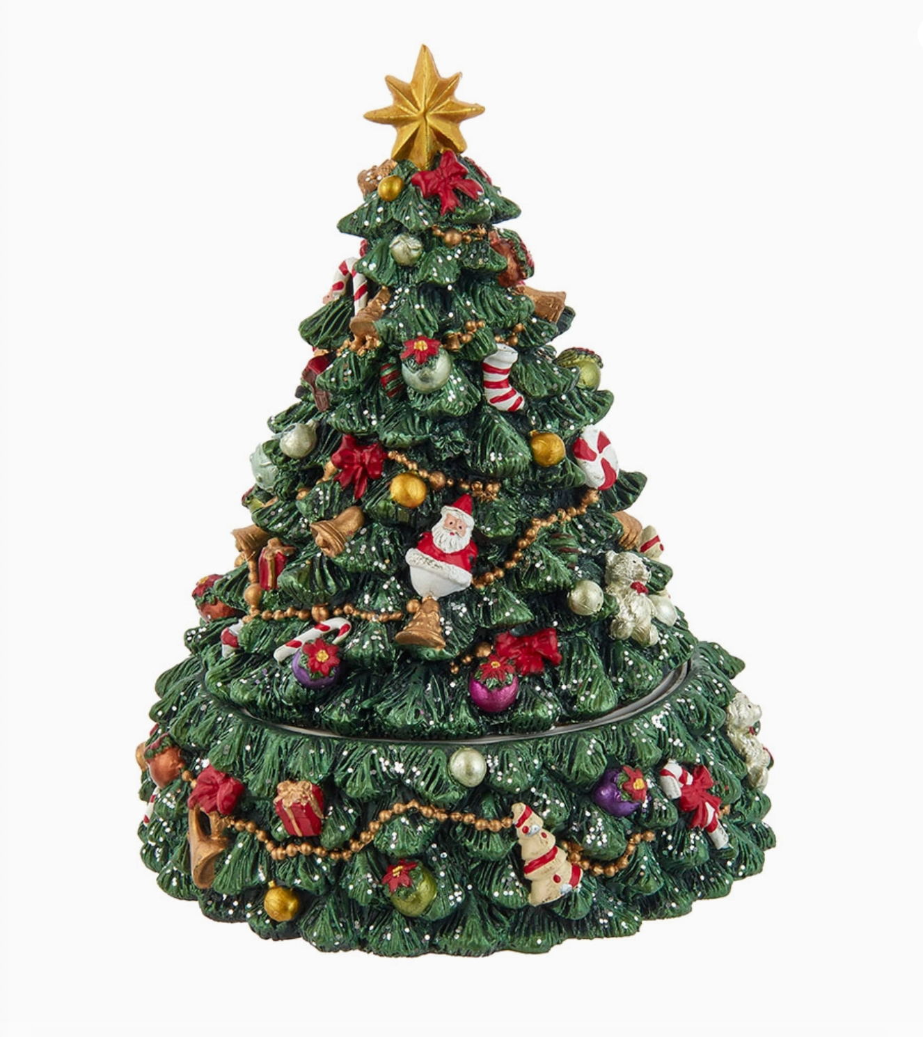 This Kurt Adler 7-Inch Christmas Tree Revolving Music Box is a festive addition to any home or office holiday décor. This decorated Christmas tree has glittered accents and a gold Bethlehem star treetop. When wound up, the Christmas tree revolves while playing the Christmas song “O Christmas Tree“.