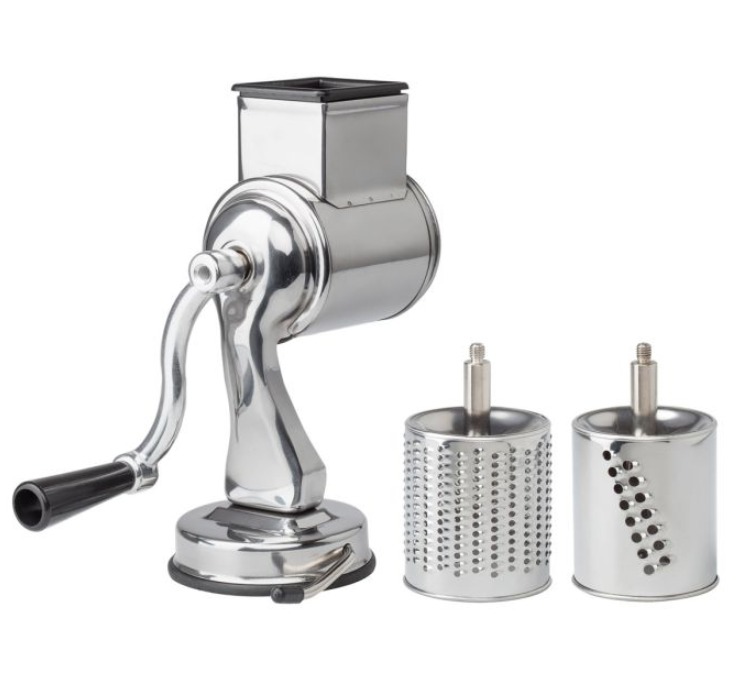 - Includes 2 grating drums (1 fine, 1 coarse), safety pusher to guide food, instructions and Fante's family recipes; hand wash with warm, soapy water