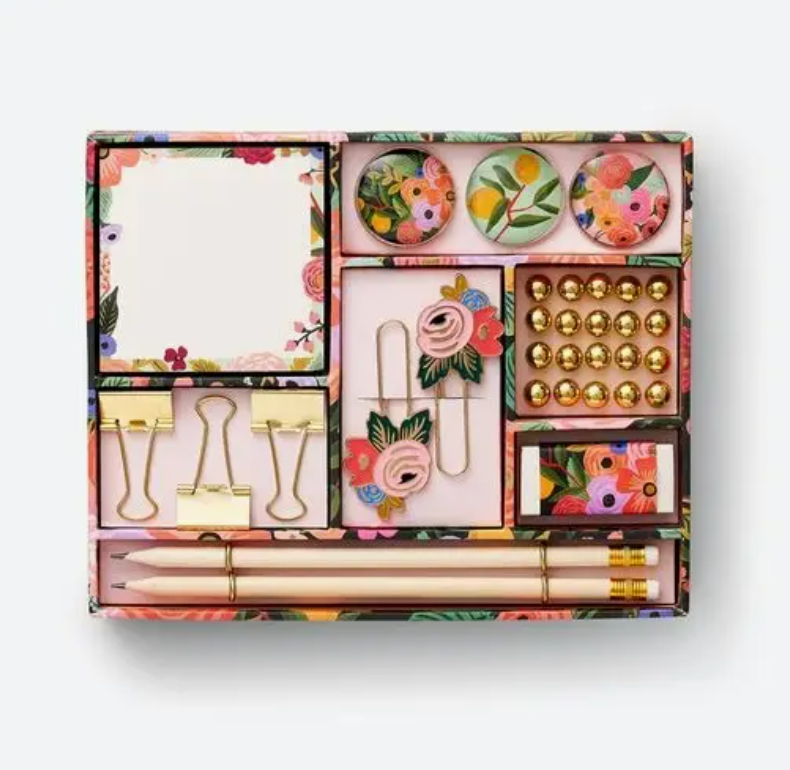 This tackle box includes all the little things you need to stay organized. The divided box is printed with our Garden Party pattern, and comes filled with pencils, push pins, binder clips, paper clips, magnets, a tear-off notepad, and an eraser. DETAILS - 8.125" L × 6.75" W × 1.5" H - Illustrated paper-wrapped box - Printed in full color - 1 tear-off pad of paper - 3 magnets - 2 enamel paper clips - 20 gold push pins - 1 white eraser - 3 gold binder clips - 2 pencils - Imported