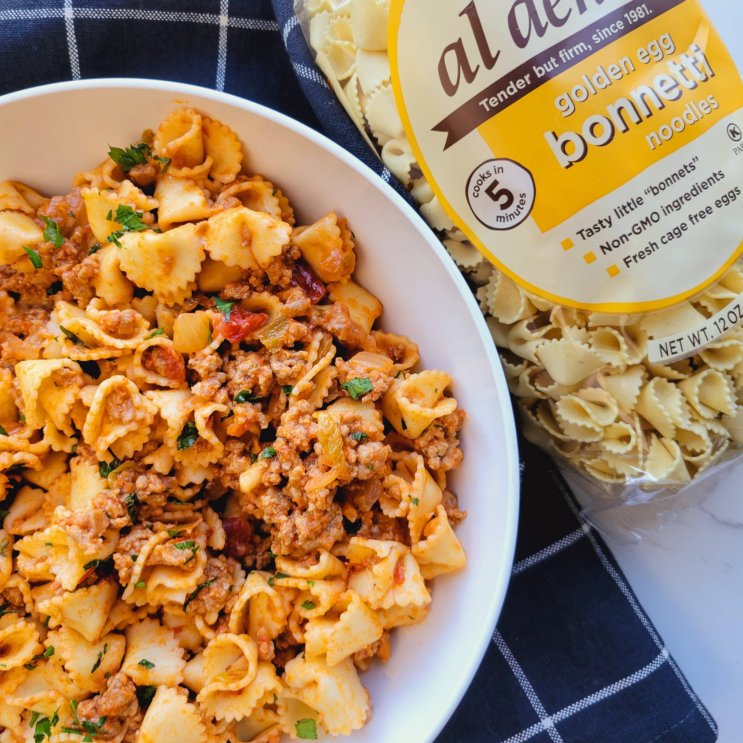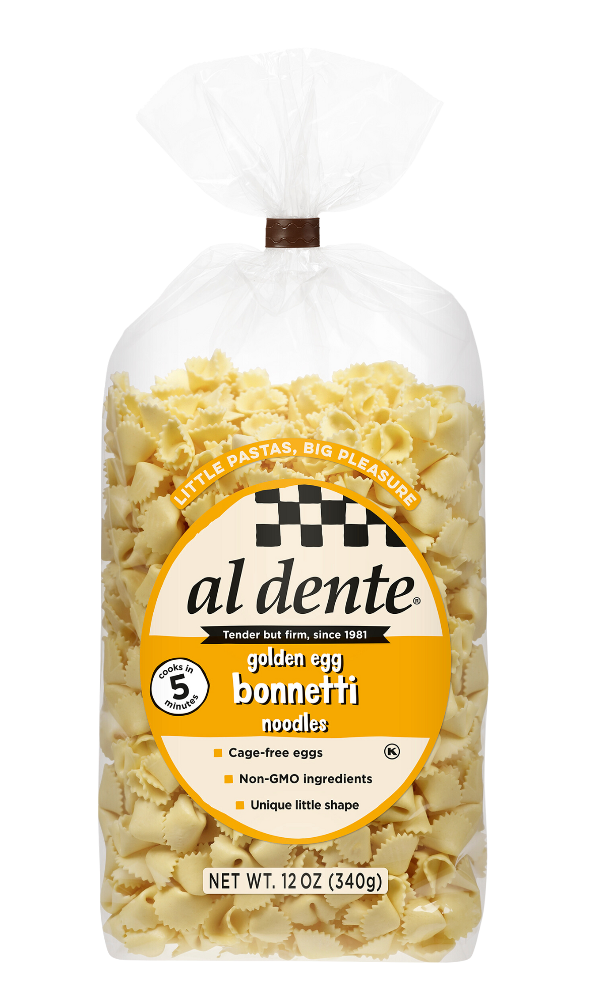 Our adorable little egg "bonnets" are made by mixing fresh, cage-free eggs with high protein, sustainably grown durum wheat. Golden Egg Bonnetti is versatile and delicious, perfectly capturing sauce or vegetable and working beautifully in pasta salads. Cooks in just 5 minutes!
