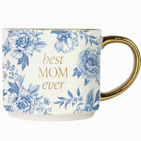 Elevate your assortment with our elegant Best Mom Ever Mug, featuring a timeless blue delft pattern. Perfect for Mother’s Day, baby shower gifts, or everyday appreciation, this mug is a meaningful addition to your gift collection. A thoughtful and versatile item your customers will love. DETAILS: • 17oz Fine Bone China • Size: 4" x 3.5" (5.5" w/ handle) • Original Design: Best Mom Ever with Blue Delft Design • Design All Around Mug • Gold Handle and Details • Stackable with Other Sweet Water Decor Gold Handle Mugs • The design printed on each mug may vary slightly from one mug to another • Designed in the USA, Imported • Style No. CM154 CARE: • Dishwasher Safe, Hand Wash Recommended to Preserve Gold Finish • Wash Before Use and Avoid Abrasive Cloths When Cleaning • Do Not Microwave