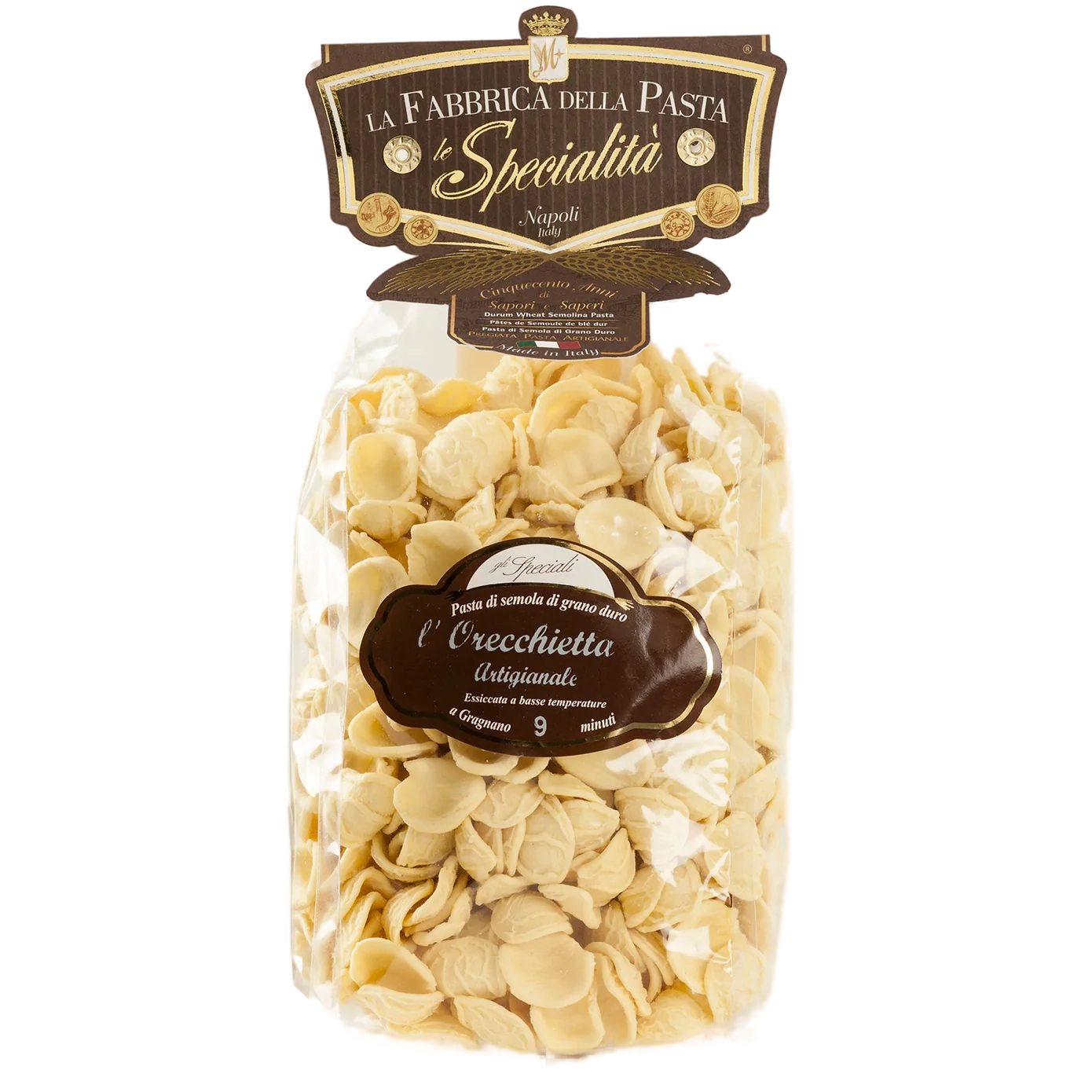 Orecchiette - literally "little ears" are traditionally prepared with sausage and a leafy green like rapini but they are also great with tomato sauces.