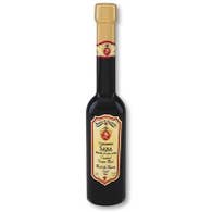 Saba, or cooked grape must, is typical of the Modena area and with a very long tradition. Also called vincotto, it is only made of cooked, concentrated grape must, has a lower acidity than aceto balsamico, with a smooth, syrup-like consistency. It is perfect for garnishing fruit and desserts, making cocktails, and dressing meat and salads. Acetaia Leonardi has been producing balsamic vinegar since the mid-19th century. They source all their grapes from their own vineyards and control every step in producing their balsamic vinegar. Grapes are picked by hand and gently pressed to prevent bitterness and the process of transforming the cooked grape juice, or grape must, into aged vinegar has been passed down from father to son for generations.